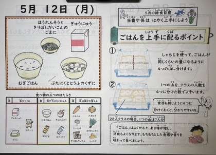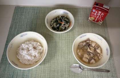 「豚肉ととうふのくず煮」は、たっぷりのとうふと豚肉が入っていて、食べ応えのある献立です。「くず煮」とは葛粉かかたくり粉をまぶして煮る煮物のことで、材料のうま味が包まれて逃げず、柔らかさを保つことができるそうです。ほんのりとしたしょうが味を楽しんで、おいしくいただきました。