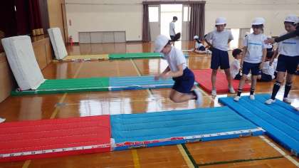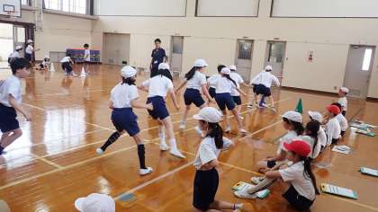 新体力テストの種目の「反復横跳び」や「立ち幅跳び」に取り組みました。「反復横跳び」では、できるだけ素早く往復運動ができるように、姿勢を低くして取り組みました。1年ぶりの挑戦でしたが、力を発揮することができたでしょうか。