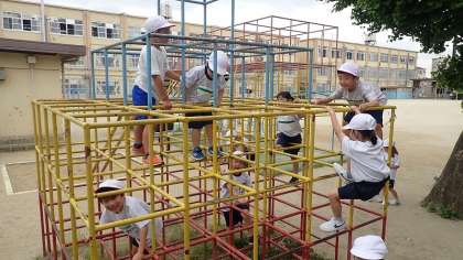 総合遊具やジャングルジムや、雲梯(うんてい)などにのぼったり棒にぶら下がって移動したりしました。総合遊具やジャングルジムで遊ぶ時は、両手・両足のうち3箇所で体を支える「3点支持」を守って、安全に遊ぶことができました。