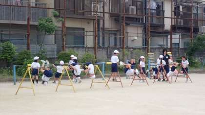 「こうもりふり」や「ちきゅうまわり」のほか、逆上がりに挑戦している子どもたちもいます。一生懸命がんばるので、手のひらには「まめ」ができている子も…。「ちょっといたいねん」と言いながらも、表情はとても生き生きしていました。