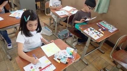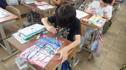 形や色などの感じをもとに、自分のイメージをもちながら、いろいろな表し方を試しながら絵に表しています。いろいろな表現の仕方を試してみることで、新しいおもしろさに気付くこともたくさんあったようです。