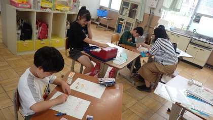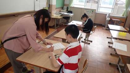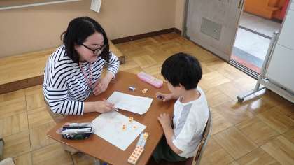それぞれの課題に応じた単元の学習に取り組んでいます。自分で課題に取り組みますが、わからないときは先生を呼んでヒントをもらいます。できたら先生に見てもらいます。「まる」をもらってうれしそうです。
