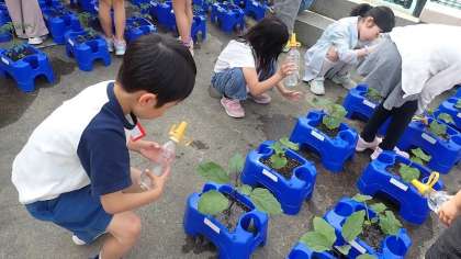 2年生は、生活科の時間で夏野菜を育てています。植木鉢に植えた苗に、毎日水やりをしています。