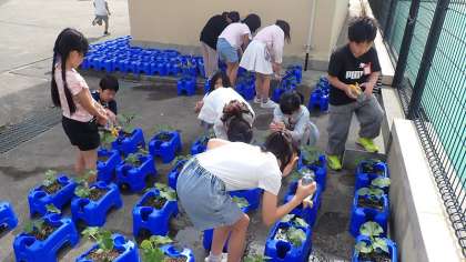 育てているのは、ナス、キュウリなどの中から子どもたちが選んだものです。大きく生長して、実がなるのを楽しみにしています。お子さんが何を育てているのか、ご家庭でも話題にしてください。