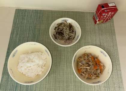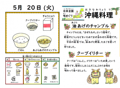 今日の給食は沖縄料理です。「チャンプル」とは、「まぜたもの」という意味で、野菜や豆腐などをいためて混ぜ合わせた料理です。今日の「油あげのチャンプル」では、油あげと野菜を使って作りました。「クーブ」は「こんぶ」、「イリチー」は「いため煮」という意味です。食材にしみ込んだ昆布のうまみを味わっておいしくいただきました。