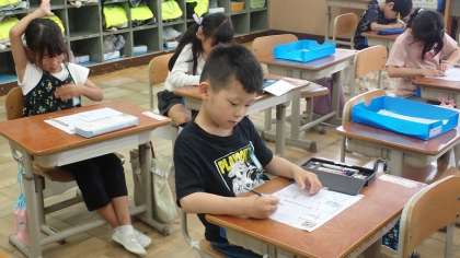 今日は、「す」を学習しました。「す」は、2画目に「結び」が入っています。「結び」をどんな形にするとよいか、結びのあとの「はらい」はどんな長さがよいかなど、お手本を見ながらていねいに書いていました。