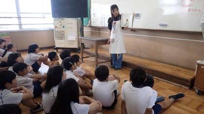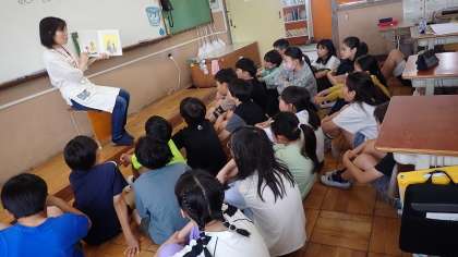 5年生での読み語りの様子です。子どもたちは、「うめのこ」さんの読み語りが大好きです。読み語りに来てくださる日は、机を下げてスペースをつくり、座って待っているクラスもあるそうです。