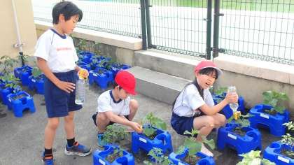 2年生は、生活科で育てている野菜に水やりをしています。毎日欠かさず水やりをしているので、少しの変化にも敏感に気付くことができます。「あ!小さなつぼみが一つ増えている!」「葉っぱが大きくなってきた」など、うれしそうな声がたくさん聞かれました。