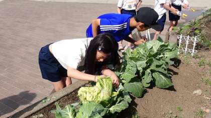 3年生は、理科の学習で育てて観察しているモンシロチョウのたまごをさがしています。学校の花壇に植えているキャベツの葉には、今でも卵がたくさんついているようです。葉の裏側をていねいにさがしていました。