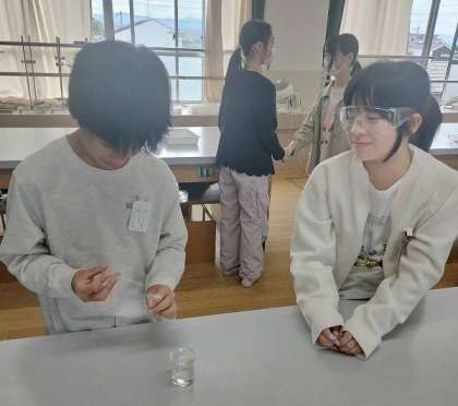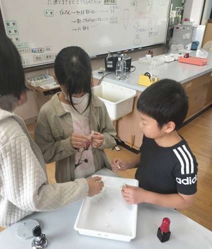 「食べ物に含まれるでんぷんは、だ液とまざるとどうなるのだろうか。」というめあてで実験に取り組みました。「そのままで変わらない」「ちがうものに変わる」「少しだけ変わる」などの予想が出ました。「でんぷんにだ液を加えたもの」と「でんぷんに水を加えたもの」にそれぞれヨウ素液を入れて変化を比べました。「だ液を加えたもの」は、色が変化しなかったことから、でんぷんはだ液によって別のものに変化したということがわかりました。