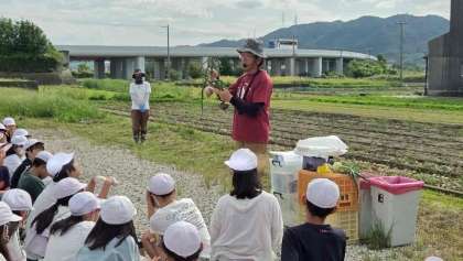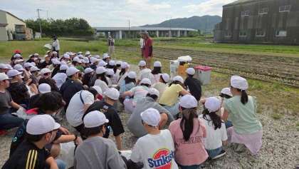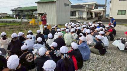 「濱田ファーム」へ到着しました。たまねぎ農家の方からたまねぎの育ち方などについてお話を聞いています。