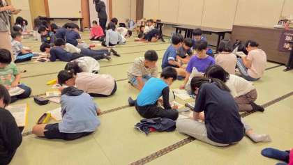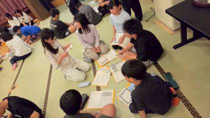 「エンタメフェス」のあとは、グループごとに反省会をしました。1日をふり返り、明日も楽しく過ごすためにがんばりたいことを話し合いました。