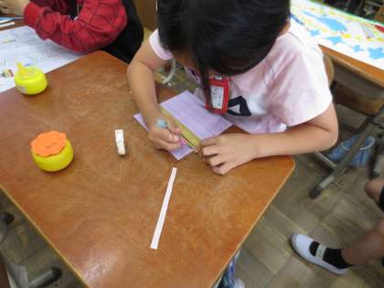 算数「長さ」で、折り紙を2cm幅に切って、輪飾りを作りました。
