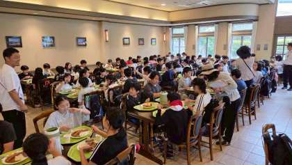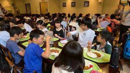 メニューは、大きいソーセージの乗ったカレーライスです。「少し辛いー。」「ちょうどいいくらい!」など言いながら食べています。
