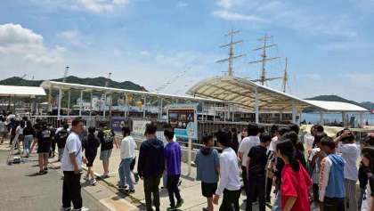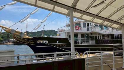 イングランドの丘を出発して、うずしおクルーズの咸臨丸に乗船するために福良港に向かっています。