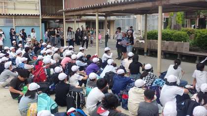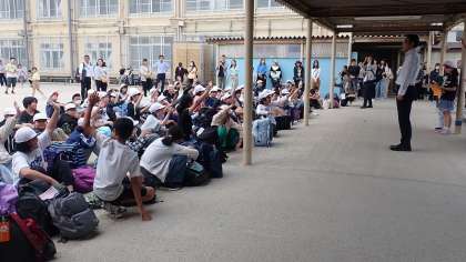 出発式を行ったのと同じ場所で、解散式を行いました。昨日の朝は、これからはじまる修学旅行にわくわくしていた子どもたちの姿がありました。今日は、少し疲れた様子は見られますが、2日間の修学旅行に満足した表情や、無事に帰ってきたことへにほっとしている様子が見られました。解散式では、児童代表の言葉や校長先生からのお話などがありました。