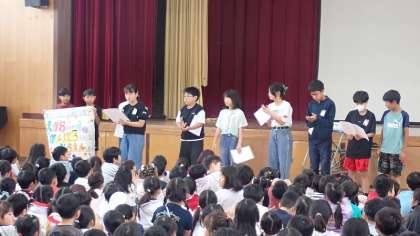 児童集会では、5・6年生が取り組んでいる各委員会の活動内容と今年のめあてについて報告がありました。