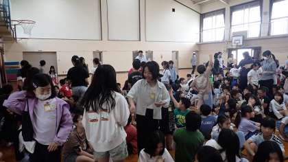 続いて、計画委員会が企画した「あっち向いてホイ大会」を開きました。2人組で「あっち向いてホイ」をして、勝ち残った8名が舞台に上がって梅津小学校のチャンピオンを決めました。1回目で負けて悔しい思いをした子も、舞台の上の戦いに注目して同じ学年の子を応援していました。