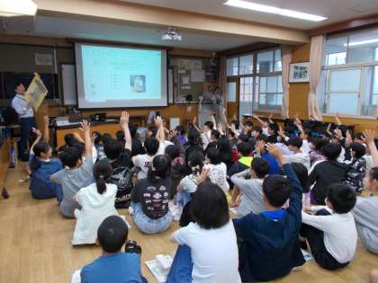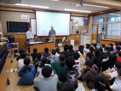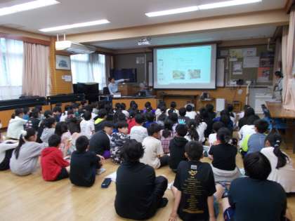 いろどり学習(総合的な学習の時間)で、まちづくり委員会と京エコロジーセンター(エコ学区サポートセンター)の方に来ていただきました。ウクレレの演奏も交えながら、楽しく「ごみ」についてお話してくださいました。子どもたちは、身近にあるごみのほとんどがリサイクルできることを知り、「ごみを減らしていきたい。」「分別を頑張る!」と思いをもっていました。