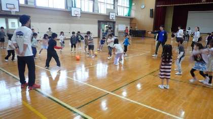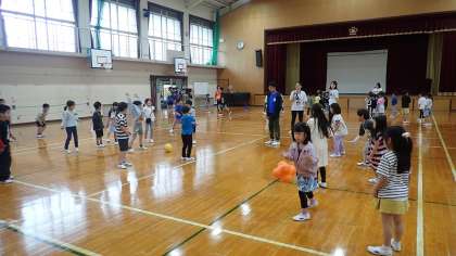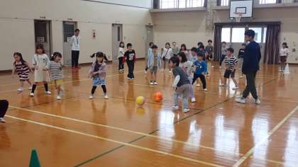 2つのコートに分かれ、それぞれがボールを2つ使って「ころがしドッジボール」をしました。ボールの1つは凸凹のついたへんてこなボールで、避けるのがちょっぴり難しかったようです。みんなの歓声が響き、とても楽しい時間を過ごすことができました。