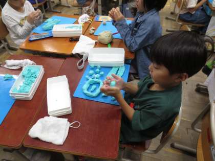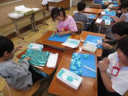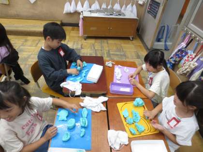 図工「にぎにぎねんど」で、粘土をにぎにぎして作品をつくりました。