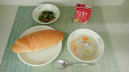 給食ではいろいろな「クリームシチュー」がありますが、今日はとうもろこしが入った「コーンのクリームシチュー」でした。コクたっぷりの手作りのルーと甘いコーンがよく合い、とてもおいしくいただくことができました。「小松菜のソテー」の緑とオレンジと合わせていろどりがよく、見た目にも楽しい給食でした。