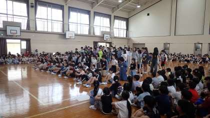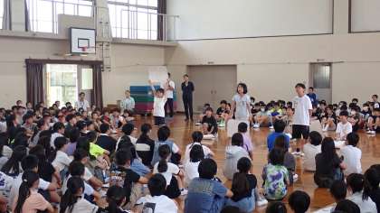 2〜6年生は、1年生を迎える会の出し物の中で、梅津小学校の学校紹介をしました。