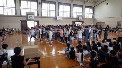 はじめに発表したのは、5年生です。5年生の子どもたちは、たてわりのなかよしグループで活動する「梅津クイズラリー」や「UMEZU祭り」などの学校行事について紹介しました。1年生にとっては、これからの学校生活でどんな行事が待っているのか、楽しみな気持ちを膨らませることになったのではないかと思います。「マツケンサンバ」の曲に乗って、楽しい雰囲気で出し物を披露してくれました。