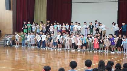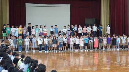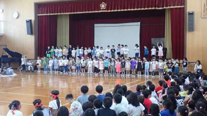 はじめに、ありがとうの気持ちやこれからの学校生活がもっともっと楽しみになってきたことを大きな声ではきはき発表しました。最後に、1年生みんなで「さんぽ」の替え歌を元気良く歌いました。上級生の子どもたちも、1年生の歌声に合わせて体をゆすったり、一緒に口ずさんだりしながら聞いていました。とっても元気な75名の1年生が、梅津小学校の仲間になりました。