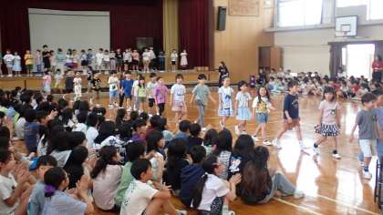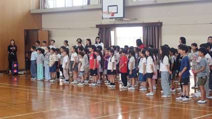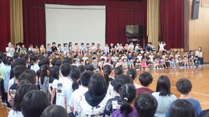 もうすぐ、1年生が入学してから2か月になります。この2か月間の間に1年生も小学校での生活にずいぶんとなじみ、楽しく学校生活を送ることができるようになってきました。今日、体育館に集まった1年生から6年生は、みんなこの梅津小学校の友達です。これからも、みんなで楽しい梅津小学校をつくっていきましょう!