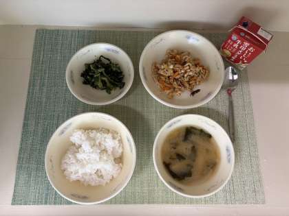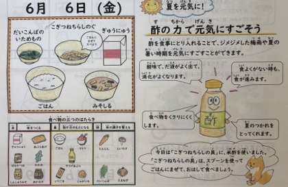 今日は、子どもたちの好きなごはんに混ぜて食べる給食です。「こぎつねちらしの具」には、たっぷりの油あげのほか、にんじんや干しいたけ、いりごまが入っています。油あげの甘さと、米酢のさっぱりした酸味の相性がよく、ごはんをおいしくいただくことができました。