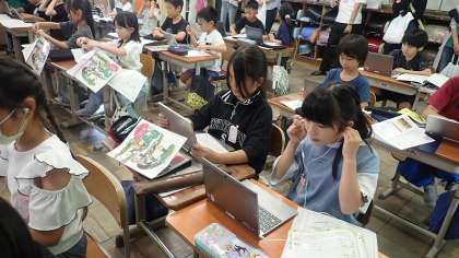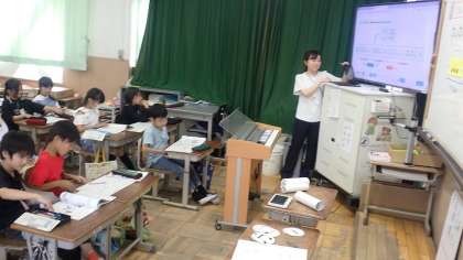 4分音符と8分音符を使って、くり返しや変化のある4小節のリズムづくりに取り組みました。タブレットPCを使ってリズムづくりをするので、何度も試したり、つくったリズムを聞いて確かめたりすることができます。お気に入りのリズムをつくることができたでしょうか。