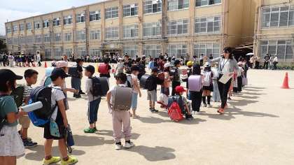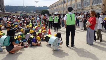 地震発生の放送に合わせて教室で一次避難し、その後運動場に二次避難をしました。今回の地震は震度5弱の想定であったため、保護者への引き渡しを行いました。きょうだい関係のある子どもたちはいちばん下のきょうだいのクラスに移動し、保護者の引き取りを待ちました。実際に大地震があった場合は、保護者への引き渡しまで時間がかかることも予想されますが、一度訓練を行ったことで、子どもたちも保護者のみなさまにも、イメージを持っていただけたのではないかと思います。お忙しい中、ありがとうございました。