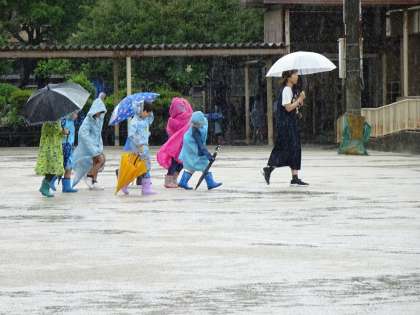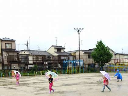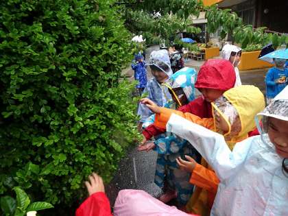 生活科の学習で、雨の運動場に出て、植物や学校の様子を観察しました。