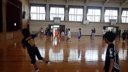 体育館で2面のコートをつくり、みんなでドッジボールをしています。たくさんの人数でドッジボールをする機会はそんなに多くないので、みんなドッジボールを楽しむことができました。