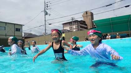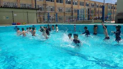プールからは1年生の歓声が聞こえていました。大きな小学校のプールで、子どもたちは思う存分みずあそびを楽しんでいました。
