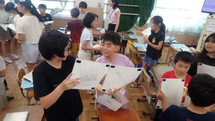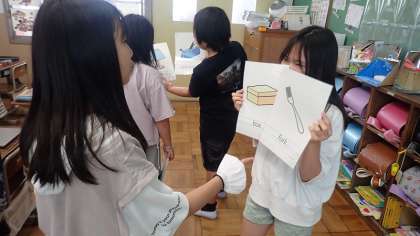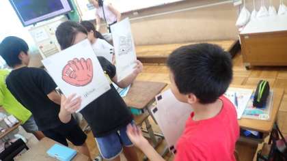 「ほしいものをたずねたり、答えたりできるようになろう。」というめあてで学習に取り組んでいます。身の回りのいろいろなものが書かれたカードを2枚ずつ持って、友達と自由に交流しました。“What do you want?”と尋ね、友達とカードの交換をしました。何度もくり返すことで、尋ね方や身のまわり物の言い方に慣れ親しむことができました。