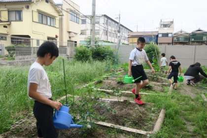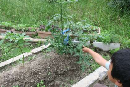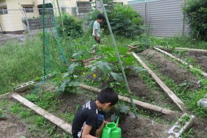 畑の野菜がすくすくと育っています。毎日、水やりや草抜きに励み、1人1担当の野菜を決めて、お世話をしています。花が咲き始めたので、実ができることを楽しみにしている子どもたちです。