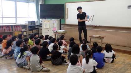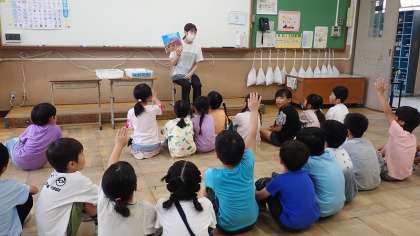「あじさい読書週間」では、図書委員会の取組や、教職員読み聞かせ、選書会などが行われます。今日は、全クラス一斉に教職員読み聞かせを行いました。自分の学年の先生ではない先生が教室に来て、絵本の読み聞かせをしてくださいました。