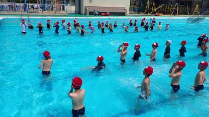 学習の約束を確かめ、準備運動をしたあと、腰洗い、シャワーを通ってプールサイドに入りました。1年ぶりの学校のプールに入ると、子どもたちからは歓声が上がりました。