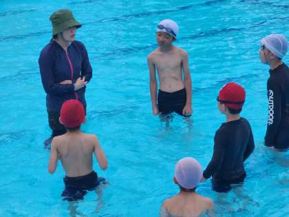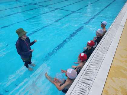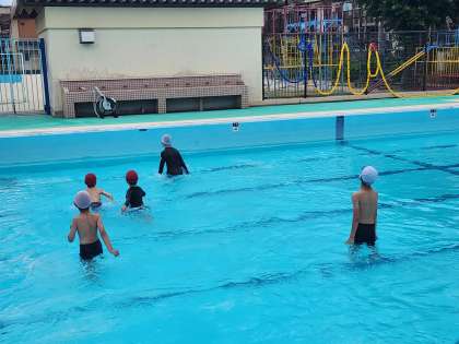 子どもたちが楽しみにしていたプール学習が、いよいよ始まりました。今年初めてのプールということで、みんな大喜び!水のかけ合いや「宝石見つけ」などの楽しい活動を通して、水に慣れることができました。