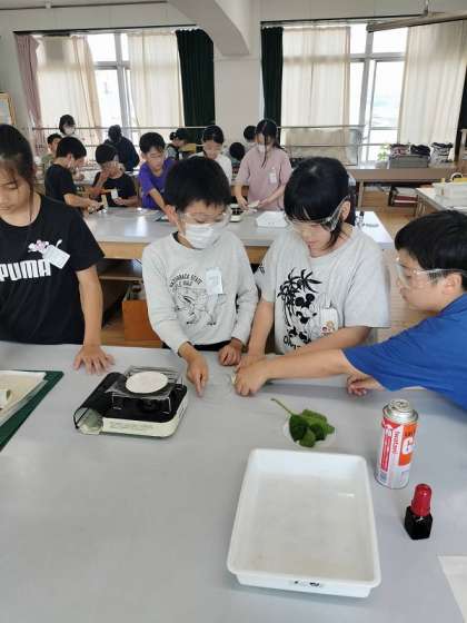 植物の葉に日光が当たるとでんぷんが作られるのかを調べる実験に取り組みました。日光を当てる葉と比較するために、日光を当てない葉には前日にアルミ箔をかぶせていました。葉をやわらかくするために沸騰した湯で葉を煮て、ろ紙に葉を挟んで木づちで叩きました。ろ紙にヨウ素液を垂らすと、日光に当てた葉の方は青むらさき色に変化しました。この結果から、日光に当たることで、植物の葉にはでんぷんが作られるということがわかりました。