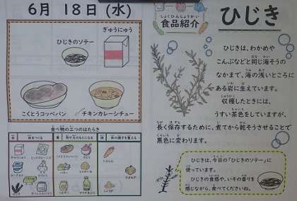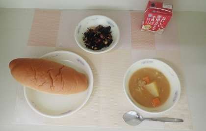 子どもたちの大好きなカレーのよいにおいが、漂っていました。「チキンカレーシチュー」は、カレーライスのルーよりもさらっとしています。今日はパンの日なので、パンと一緒においしくいただきました。「ひじきのソテー」は、ひじきの味が口いっぱいに広がり、とてもおいしくいただきました。