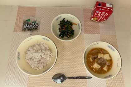 「五目どうふ」には、豆腐の他にも豚肉、たまねぎ、にんじん、干しいたけなど、たくさんの具が入っています。ほどよくしょうがが効いており、たっぷりの豆腐といっしょにおいしくいただきました。「ほうれん草のいためもの」は、ごはんによく合う献立です。ほうれん草やにんじんのあま味を味わって、おいしくいただきました。