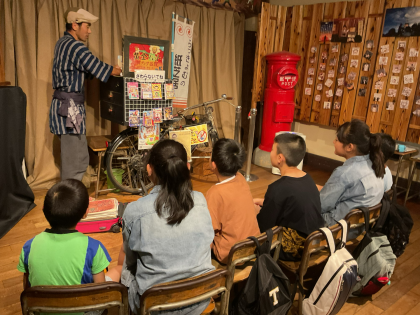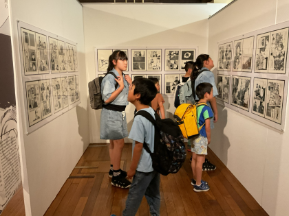 マンガミュージアムでは、日本のマンガ文化について学びました。また、紙芝居の上演を鑑賞し、昔ながらの物語の語り口や絵の表現にふれることができました。子どもたちは、紙芝居の世界に引き込まれながら、楽しく学ぶことができました。