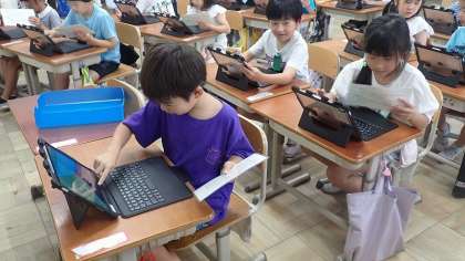 1年生は、GIGA端末を使ってはじめてのログインに挑戦しました。