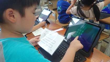 担任の先生からiPadを渡していただき、教えてもらった通りに画面に触れると、画面が表示されます。それだけで大さわぎ!画面をスワイプしてパスコードを入力画面に変わると大歓声です。初めて触れるGIGA端末に、子どもたちも感激しているようでした。