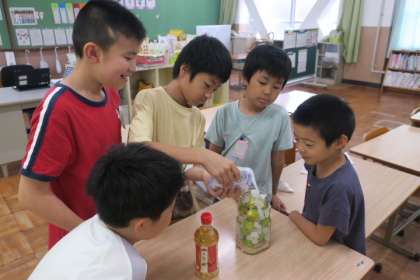 子どもたちと一緒に梅ジュース作りを行いました。青梅の香りを楽しみながら、ひとつひとつ丁寧にヘタを取り、氷砂糖と一緒に瓶に詰めました。