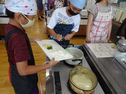 みそ汁に入れる実は、「あぶらあげ」「だいこん」「ねぎ」です。それぞれ、短冊切り、いちょう切り、小口切りで食べやすい大きさに切りました。