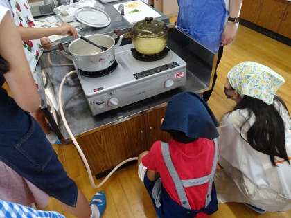 みそ汁を調理している間にも、ごはんの様子も気になります。透明のガラスなべの様子を観察して、ごはんがどんな状態で炊きあがっていくのかもしっかり観察しました。